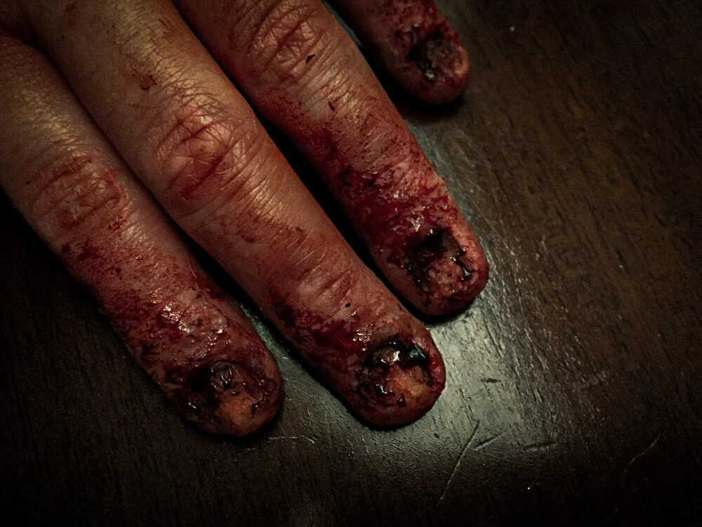 The special effect I wanted to recreate the most, and one which seemed the most achievable, was the pealed off fingernails. I've done a similar effect prior and knew my way around it. However, having worked on this a few months back, I can now see that there is a much better way of going about this.